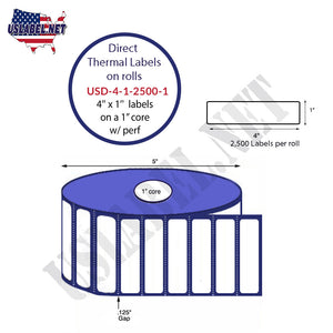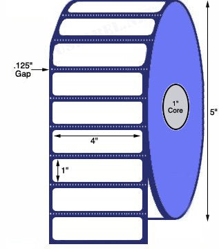 This is a 4'' x 1'' Direct Thermal label on a 1'' core 5'' OD with 2500 labels on roll with 12 in the box = 30000 labels in the box. This label does not require a ribbon and ships same day next business day.