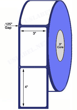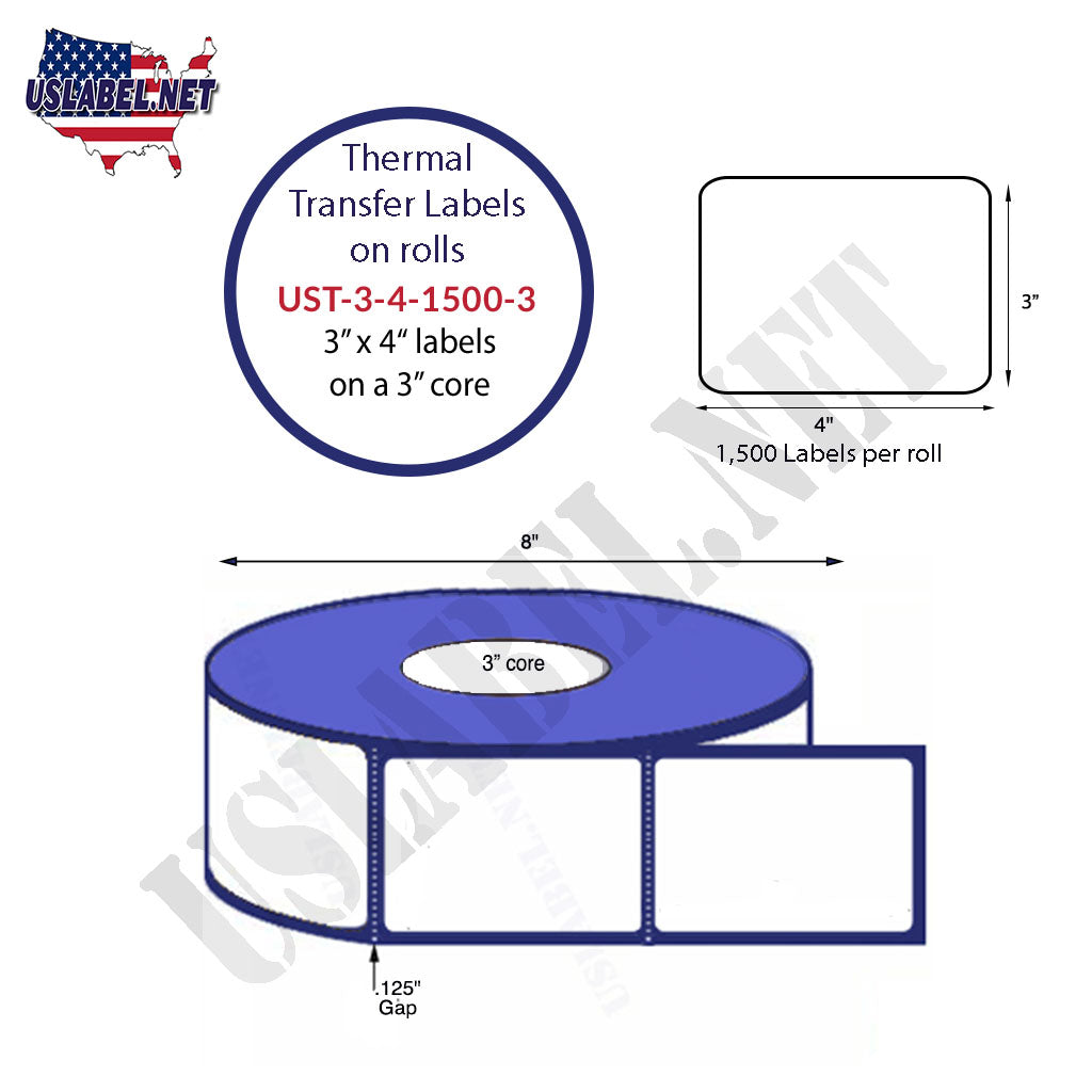This is a 3'' x 4'' Thermal Transfer label on a 3'' core with 8'' OD with 1,500 labels on a roll with 8 rolls in the box = 12,000 labels in the box. This label requires that you use a ribbon and ships same day next business day.3'' x 4''Thermal Transfer Labels on a 3 ''Core 8 ''OD.