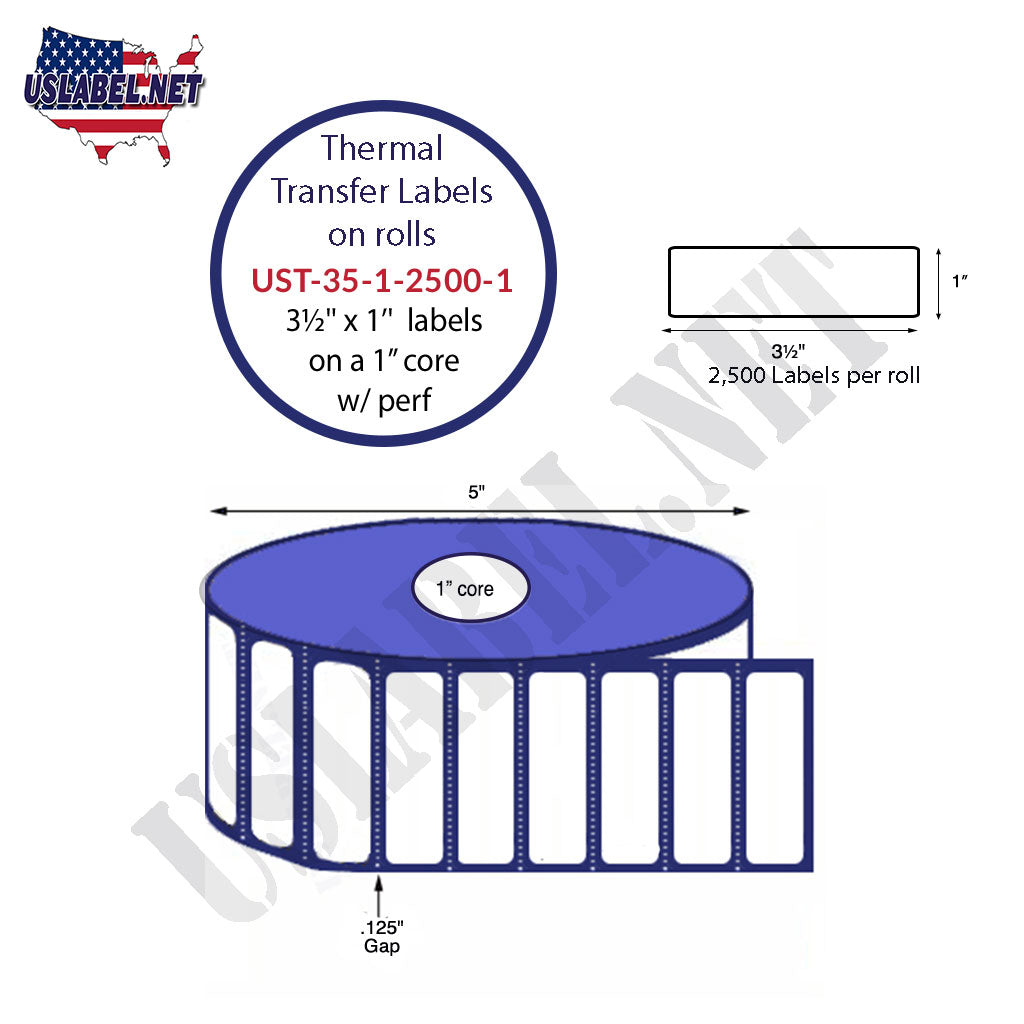 This is a 3.5'' x 1'' Thermal Transfer label on a 1'' core with 5'' OD with 2500 labels on a roll with12 rolls in the box = 30000 labels in the box. This label requires that you use a ribbon and ships same day next business day.